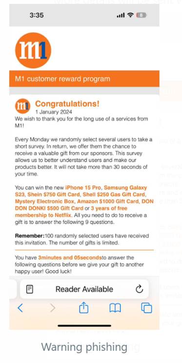Below are some of the phishing emails, SMSes, and other forms of communication that we’re aware of posing as M1. Please refer to this page for the latest report.
